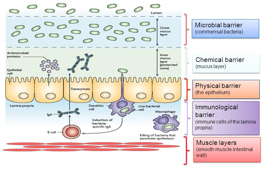 Gut Structure and Function: The lower gastrointestinal tract consists of the small and large intestines which are referred to as the gut. The gut has a multi-layer system made up of gut microbiota, mucus, and epithelial cells. The microbial barrier or the gut flora consists of commensal friendly or probiotic bacteria that not only provide nutrients such as ferment fiber, release short-chain fatty acids, and synthesize other key nutritional components such as Vitamin K2, it also suppresses the growth of unfriendly bacteria such as yeast. The mucus layer is produced by the Goblet cells in the intestinal lining which prevent bacteria from adhering to the gut lining and regulates diffusion to the host tissues by filtering the toxins from being absorbed. The intestinal epithelial layer forms the most important barrier between the internal and external environment. The tight junctions are responsible for sealing the intercellular space and functions as a selective/semipermeable barrier that facilitates the passage of ions and solutes while stopping the passage of antigens and toxins. The immunological barrier sorts between pathogens and bacterial microorganisms as well as regulates the immune tolerance and response to pathogens.