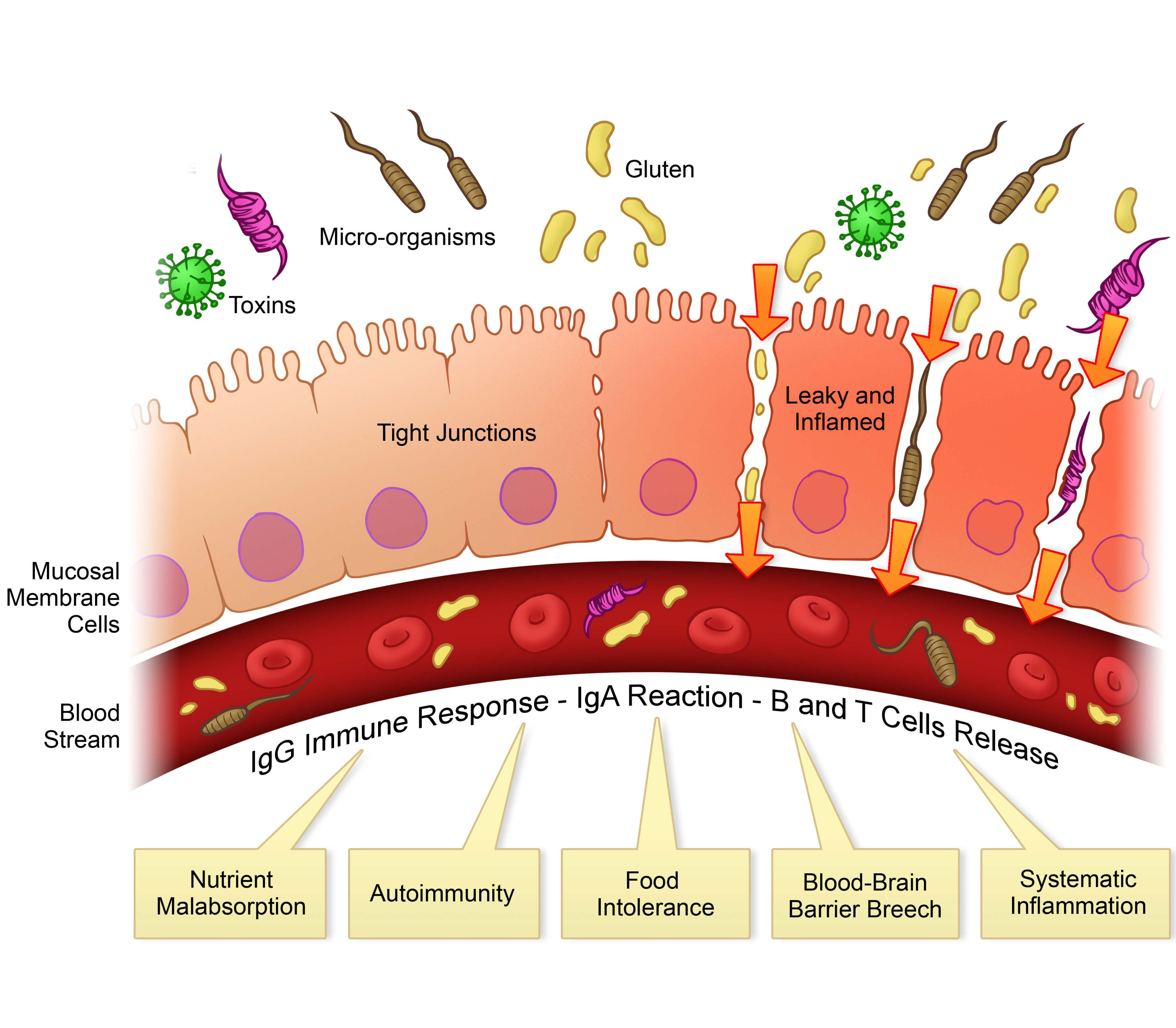 Causes: Although the cause of leaky gut and the disruption of the tight junction is still under speculation, the theory is that it is the result of damage to the intestinal lining from genetic predisposition, diet, drugs/antibiotics, or a compromised immunity.