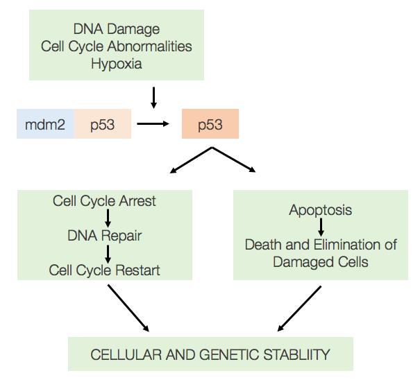 Hundreds of cancer-associated genes have been discovered with p53 being one of the most common mutants. The p53 protein is a gene that codes for a protein that regulates the cell cycle and functions as a tumor suppressor. The p53 protein is directly involved in both growth arrest and apoptosis. DNA damage, cell cycle abnormalities, and hypoxia all can activate the p53 protein. Therefore, an abnormal p53 protein allows oncogenic cells to keep replicating which can lead to the development of cancer.