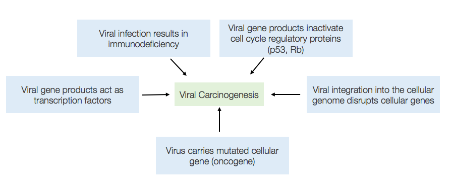 An oncovirus is a virus that can cause cancer. There are seven viruses that have been identified as an oncovirus including Hepatitis C and B virus, human papillomavirus (HPV), human T-lymphotrophic virus (HTLV-1), Merkel Cell Polyomavirus, Epstein-Barr virus (EBV), Human immunodeficiency virus (HIV), and Human herpesvirus 8 (HHV-8). In most cases, specific viruses only affect specific cells. Viruses use a variety of mechanisms to promote neoplasia (growth of abnormal tissue) through both direct and indirect mechanisms. Most of these viruses either interfere with the p53 protein or are taken up by healthy cells and are copied and replicated which can integrate into the host cell genes. By integrating the viral DNA into host cell chromosomal DNA, they may cause mutations and chromosomal rearrangements that predispose the cell to cancer. The insertion of viral promoter sequences adjacent to certain host genes can lead to ectopic gene expression resulting in neoplasia.