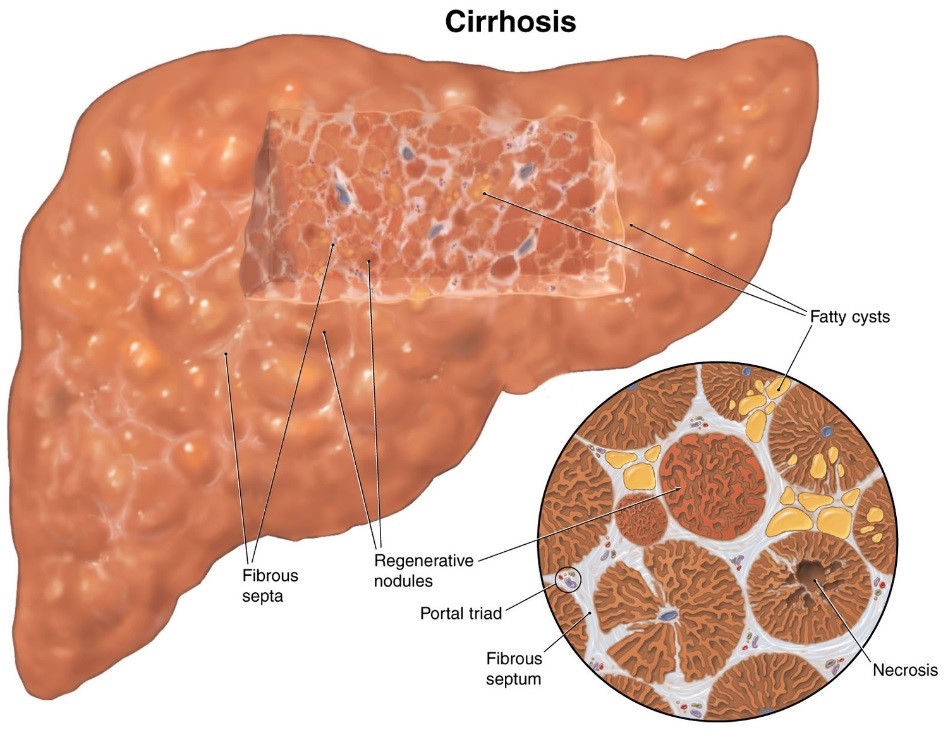 Cirrhosis is a slowly developing chronic liver condition in which liver tissue is replaced with scar tissue. Damage to the liver produces scarring and fibrotic tissue which can block blood flow through the liver and eventually slows the liver’s ability to process hormones, nutrients, drugs, and toxins. Cirrhosis also reduces the production of proteins secreted from the liver such as albumin, fibrinogens, and apolipoproteins. Eventually, the liver can no longer function and liver failure occurs. The most common causes include chronic alcohol abuse, nonalcoholic fatty liver disease, hepatitis B and C or other types of liver infections, prescription drugs, and prolonged exposure to environmental toxins.