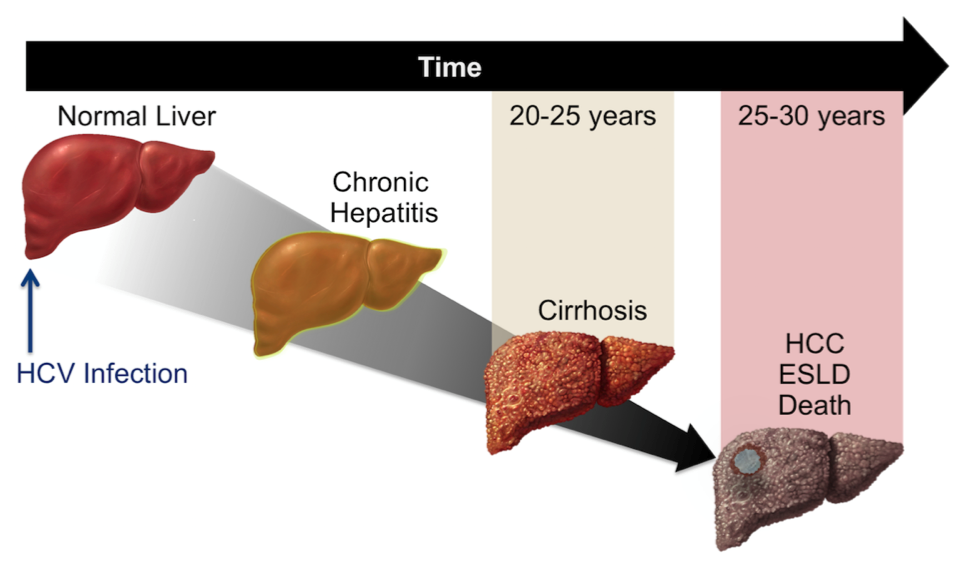 The next stage is classified as cirrhosis of the liver when thick bands of fibrotic tissue and nodules replace normal hepatic parenchyma. The progression toward cirrhosis is a slow process and can take many years. Patients may not be fully aware until the progression gets to a severe state. With the further progression of liver cirrhosis, the liver's fundamental structure is deformed, and the framework begins to collapse. Cirrhosis can eventually lead to chronic liver failure which can be deadly.