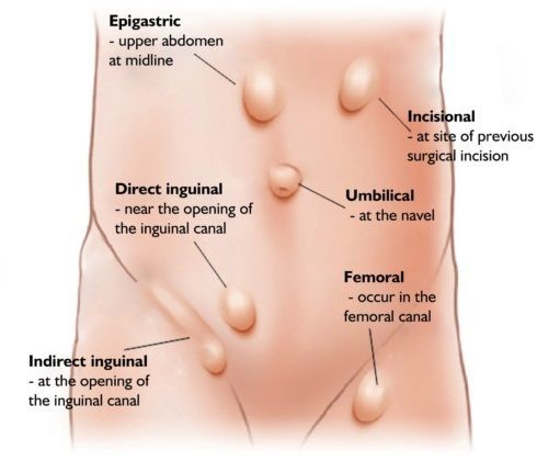 Hernias occur when an organ or fatty tissue protrudes through a weak spot in the surrounding muscle or connective tissue. The most common types of hernias include inguinal, femoral, umbilical, and hiatal. Most hernias occur in the abdomen. There are usually no symptoms. Some people have discomfort or pain. The discomfort may be worse when standing, straining, or lifting heavy objects. In time, the most common complaint is a bump that is sore and growing. When a hernia gets bigger, tissues may get trapped in the outpouching of the abdominal wall and lose its blood supply which may result in tissue death. This is called strangulation. Symptoms include nausea and vomiting and not being able to pass gas or have bowel movements. When this occurs, surgery is needed right away