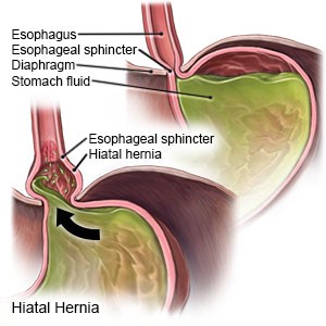 hiatal hernia occurs when the upper part of the stomach pushes through the hiatus, an opening in the diaphragm. The cause is often unknown but may occur due to poor blood circulation and muscle weakness in the surrounding area. Small hiatal hernias may not cause any symptoms but once large enough it can allow acid back up into the esophagus, causing acid reflux ad heartburn that is worse when bending over or lying down. Other symptoms include chest pain and swallowing difficulty.