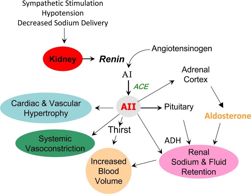 The RAS regulates blood pressure by modulating vascular smooth muscle contractions. When blood pressure is reduced, the blood flow to the kidneys is also reduced. The reduced blood flow to the kidneys triggers the juxtaglomerular cells in the kidneys to convert pro-renin in the blood to renin which is secreted directly into circulation. Renin will catalyze the formation of angiotensin I from angiotensinogen which is synthesized by the liver. Angiotensin I is subsequently converted to angiotensin II by the angiotensin-converting enzyme (ACE) found in the lungs. The angiotensin II then binds to the receptors on the blood vessel cells. The type I angiotensin II receptor (AT1) will be become activated upon binding to angiotensin II and trigger activation of G-proteins and protein kinase to initiate the signal transduction inducing vascular smooth muscle contractions to raise blood pressure. Over activation of RAS can cause high blood pressure.